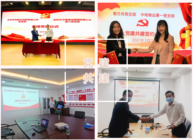 在各黨支部完成換屆選舉後,中電物業黨委高度重視(shì)黨建共建工作(zuò),下(xià)屬四個(gè)黨支部積極作(zuò)為(wèi),分(fēn)别與兄弟企業進行黨建共建,其中中電物業第一(yī)黨支部與智方舟黨支部,中電物業第二黨支部與迪富酒店(diàn)黨支部,中電物業第三黨支部與中電智谷黨支部、中電物業第四黨支部與桑達股份房(fáng)産經營部黨支部分(fēn)别舉辦了(le)“黨建共建簽約儀式”,并制定共建方案,簽訂共建協議(yì)。